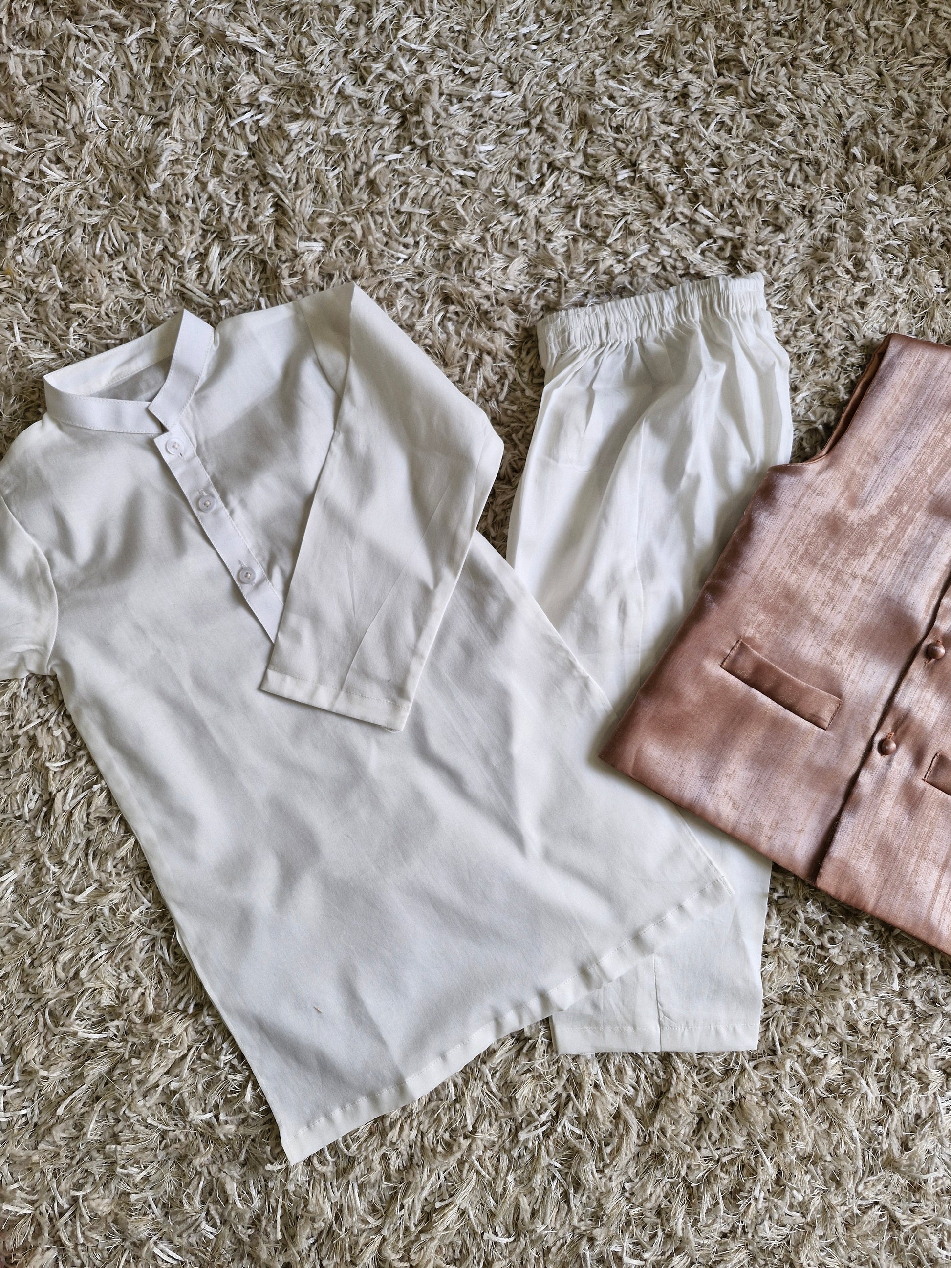 Bring timeless elegance to your little one’s wardrobe with this three-piece festive set. Crafted with care, the classic white kurta pajama is paired with a stunning sheesha silk waistcoat, designed with delicate detailing that adds just the right amount of festive charm.
